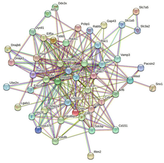 STRING-based analysis of the intra-set interactivity of 47 mouse proteins entrapped in RABV particles. In the corresponding network, the nodes correspond to proteins, whereas the edges show predicted or known functional associations. Seven forms of evidence are used to build the corresponding network and are indicated by the differently colored lines: a green line represents neighborhood evidence; a red line, the presence of fusion evidence; a purple line, experimental evidence; a blue line, co-occurrence evidence; a light blue line, database evidence; a yellow line, text mining evidence; and a black line, co-expression evidence [50].