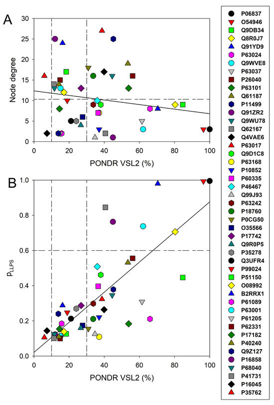 Correlation between the intrinsic disorder levels in the host proteins entrapped in RABV particles and their interactivity within the intra-set PPI (A) and predisposition for being involved in liquid–liquid phase separation, LLPS (B). Solid lines in both plots show linear fits of the reported data, whereas short–long–dashed lines represent boundaries between different disorder categories, as well as between hubs and non-hubs (A) and LLPS promoters and other proteins (B).