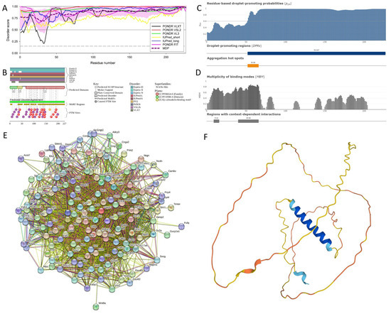 Functional disorder analysis of mouse neuromodulin (UniProt ID: P06837). (A) Per-residue disorder profile generated using RIDAO, showing that a major portion of this protein has a predicted value of disorder above the established threshold (0.5). (B) Functional disorder profile generated for neuromodulin using the D2P2 database, showing the outputs of several disorder predictors such as VLXT, VSL2b, PrDOS, IUPred, and Espritz. The colored bar highlighted by blue and green shades represents the disorder prediction; colored circles below the bar shows the predicting PTMs. (C) The FuzDrop-generated plot showing the sequence distribution of the residue-based, droplet-promoting probabilities, pDP. (D) The FuzDrop-generated plot of the multiplicity of binding modes, showing positions of regions that can sample multiple binding modes in the cellular context (sub-cellular localization, partners, and posttranslational modifications)-dependent manner (residues 9–16 and 40–66). (E) Protein–protein interaction network generated using STRING. This PPI network was generated by using the minimum required interaction score of 0.4 (medium confidence) and adjusting the value of a maximum number of interactors to 500. Network nodes represent individual proteins, and edges represent protein–protein interactions for shared function, with the types of interactions; the blue line represents curated databases, the black line is for co-expression, and the green line is for the gene neighborhood. (F) The 3D structural model is predicted through AlphaFold. The structure is colored according to the per-residue model confidence score, ranging from orange to blue fragments of the structure, from a very low (pLDDT < 50) value to very high confidence (pLDDT > 90), respectively.