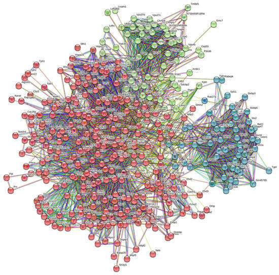 The STRING database strives to incorporate all established and predicted connections among proteins, comprising both the physical and functional associations [48,49,50]. Users get to analyze network visualizations, predicted connections, and functional annotations for the analysis of proteins. PPI networks of proteins were retrieved by using the STRING database (https://string-db.org, accessed on 10 March 2024). For the analysis of protein interactions through STRING, we used a medium confidence level and 500 interactors in the 1st shell to generate the PPI network. For the global interactions network, the 11 most disordered proteins were used to generate a PPI network, using the same settings mentioned above. The functional enrichment data of these proteins can be found in Supplementary Tables S1–S3.