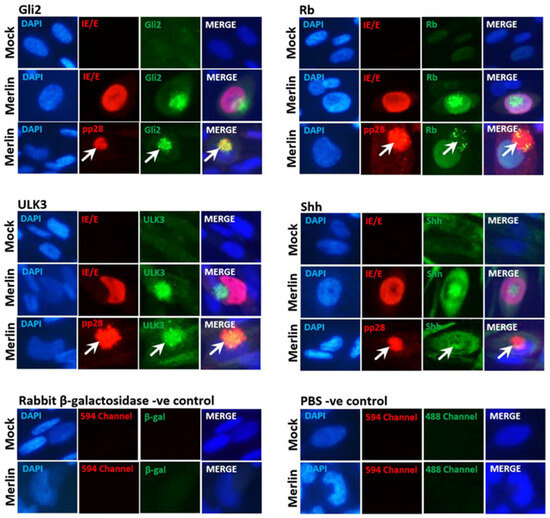 In a previous study, we showed that the AD169 and Merlin infection of TEV-1 cells resulted in cellular re-localization and accumulation of DYRK1A and DYRK1B [31]. In this study, immunofluorescence was performed on mock- and Merlin-infected TEV-1 cells at 7dpi for the Sonic Hedgehog signaling (SHH) proteins Gli2, Rb, Ulk3, and Shh (Figure 1). In mock-infected TEV-1 cells, Gli2, Ulk3, and Shh proteins were diffusely observed predominately in the cell cytoplasm. Merlin infection resulted in the accumulation of Gli2, Ulk3, and Shh in clusters of punctate staining in the cell cytoplasm. These proteins predominantly re-localized to the virion assembly complex (VAC), as demonstrated by co-localization with the VAC-associated CMV protein pp28 (UL99) (Figure 1). The Rb protein was observed in the nucleus of uninfected TEV-1 cells. Merlin infection induced the accumulation of Rb in the nucleus and partial re-localization to the VAC with punctate staining.