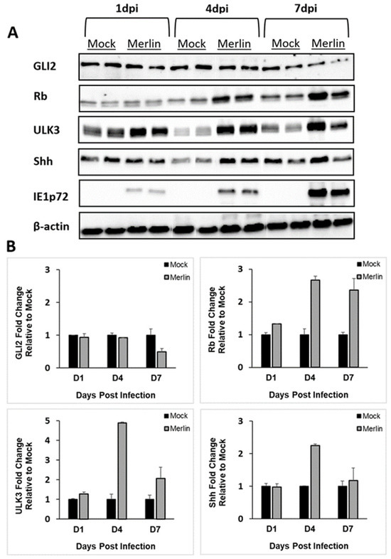 Western blot analyses were performed to determine the effects of CMV-infection on the expression of SHH proteins in TEV-1 cells (Figure 2A). Densitometry analysis using ImageJ was performed to quantitate protein expression in CMV-infected cells relative to the uninfected (mock) control cells at days 1, 4, and 7 post-infection, and the bands were normalized to β-actin (Figure 2B). At 1 dpi, no alterations were observed in Gli2, Rb, Ulk3, or Shh levels in Merlin-infected cells relative to mock. At 4 dpi, Rb, Ulk3, and Shh protein levels increased, but not Gli2 in Merlin-infected TEV-1 cells relative to mock. At 7dpi, relative to mock-infected cells, Rb, Ulk3, and Shh protein expressions increased, and Gli2 exhibited a small reduction in protein levels in Merlin-infected cells.