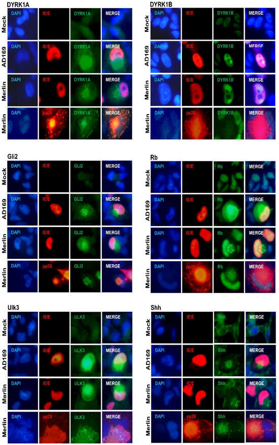 We have previously shown that the CMV infection of placental trophoblasts, ex vivo placental explants, and naturally infected clinical placentae results in the upregulation and re-localization of DYRK1A to the cytoplasm, and VAC and DYRK1B to the nucleus [31]. Immunofluorescence was performed at 7 dpi on mock-, AD169-, and Merlin-infected NHA cells for DYRK and SHH proteins (Figure 3). In mock-infected NHAs, DYRK1A, Gli2, and Ulk3 were diffusely localized in the nucleus and cytoplasm. The DYRK1B and Rb proteins were diffusely localized in the nucleus, and Shh in the cytoplasm. Upon AD169 or Merlin infection, the aberrant re-localization and accumulation of these proteins were detected. The DYRK1A, Gli2, and Shh proteins accumulated in the cytoplasmic virion assembly complex. The small punctate accumulation of DYRK1B was observed in infected cell nuclei corresponding to the CMV nuclear replication compartments. Rb and Ulk3 accumulated in both the nucleus and cytoplasm of infected cells relative to mock.