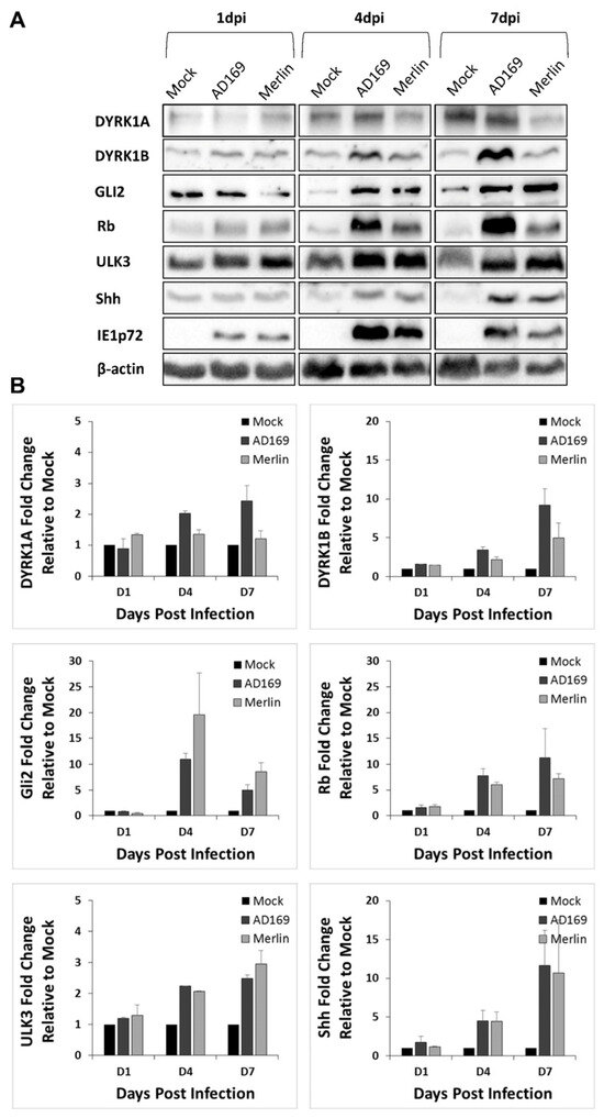 Western blot analyses were performed to determine the effects of CMV-infection on the expression of DYRK and SHH proteins in NHA cells (Figure 4). Densitometry analysis using ImageJ was performed to quantitate protein expression in CMV-infected cells relative to the uninfected (mock) control cells at days 1, 4, and 7 post-infection, and the bands were normalized to β-actin. At 7 dpi, DYRK1A was only upregulated in AD169-infected cells but not in Merlin-infected cells, which may be a biological consequence of the difference between CMV strains. Upregulation was detected in DYRK1B, Gli2, Rb, Ulk3, and Shh in both AD169- and Merlin-infected NHA cells. The changes in protein expression in CMV-infected NHA cells were time-dependent, and these proteins were dysregulated during early to late stages of CMV replication, i.e., 4 dpi and 7 dpi.