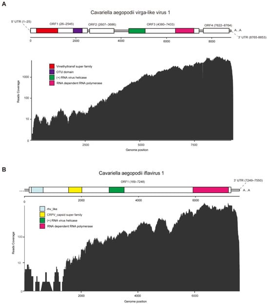 The genome structure and RNA-seq read coverage of CAVLV1 (A) and CAIV1 (B). The white frame shows ORFs. Different colored blocks represent different domains of protein; red represents the Vmethyltransf superfamily; purple represents the OTU domain; green represents the (+) RNA virus helicase; pink represents RNA-dependent RNA polymerase; blue represents rhv_like; and yellow represents CRPV_capsid super family. RHV, picornavirus capsid protein domains; CRPV, cricket paralysis virus; OTU, ovarian tumor.