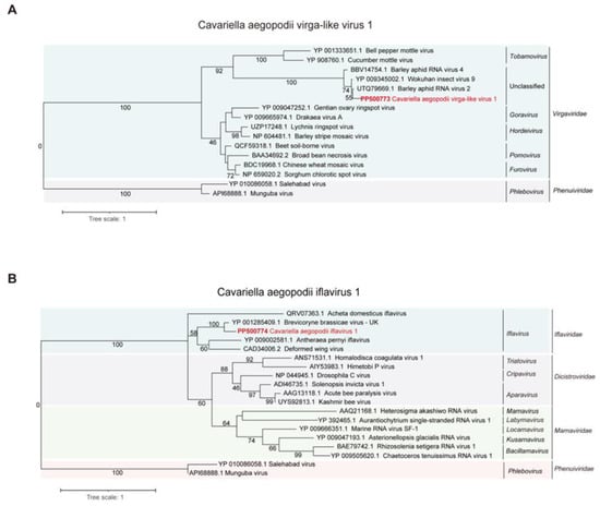 With the advancement of high-throughput sequencing and bioinformatics analysis, numerous RNA viruses have been identified, providing deeper insights into insect viromes and viral evolution. Recently, a large number of RNA viruses have been found in a variety of aphids, such as Myzus persicae [27]. In our work, two new insect RNA viruses, called asCAVLV1 and CAIV1were identified in C. aegopodii. Rod-shaped virions are characteristic of most virga viruses, with the exception of tobamo viruses (genus Tobamovirus), for which the vectors remain unknown. These viruses are primarily transmitted by soil-dwelling organisms, such as plasmodiophorid protists or nematodes. The hosts are mainly plants, but some virga-like viruses have also been reported in insects [14].
