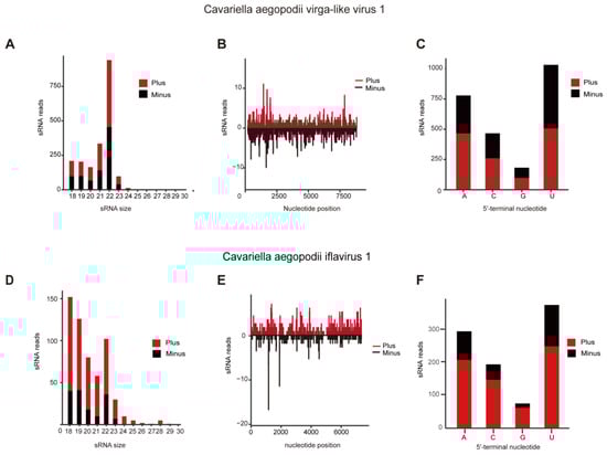 The siRNA analysis of CAVLV1 and CAIV1. (A) The characteristic and amount of sRNA derived from CAVLV1. (B) Presence of sRNA produced by CAVLV1 on the whole genome. (C) Preference of 5′-end sequence of CAVLV1. (D) The characteristic and amount of sRNA derived from CAIV1. (E) Presence of sRNA generated by CAIV1 on the entire genome. (F) Preference of 5′-end sequence of CAIV1.