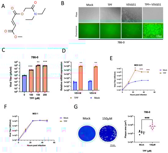 Tepilamide fumarate demonstrates remarkable viral sensitizing capabilities. (A) The structure of Tepilamide fumarate (TPF). The 786-0 cells were pre-treated with different doses (0, 100, 150, and 200 µM) of TPF for four hours and then infected with VSVΔ51 expressing GFP (MOI 0.05). (B) GFP images were captured 24 h post-infection. (C) The samples were quantified for viral titer by standard plaque assay (N = 3, mean ± SD; ** p < 0.01 *** p < 0.001; one-way ANOVA with Dunnett’s multiple comparisons test compared to Mock). (D) VSV-M and VSV-N mRNA were quantified by RT-qPCR (N = 3, mean ± SD; *** p < 0.001 by Student’s t-test). Multistep (MOI 0.01) and single-step (MOI 1) growth curves were generated. (E,F) The 786-0 cells were pre-treated with TPF and infected with VSVΔ51 at an MOI of 0.01 or 1, and the samples were quantified for viral titer by high throughput method (N = 3; mean ± SD; * p < 0.05, *** p < 0.001; two-tailed t-test). (G) The 786-0 cells underwent treatment with TPF at a concentration of 150 µM, followed by infection with VSVΔ51 at an MOI of 0.01. After an incubation period of 1 h, the cells were overlaid with agarose. At 48 h post-infection, Coomassie blue staining was performed. The area of randomly selected plaques was then measured (N = 7), and a two-tailed t-test revealed a highly significant difference (*** p < 0.001).