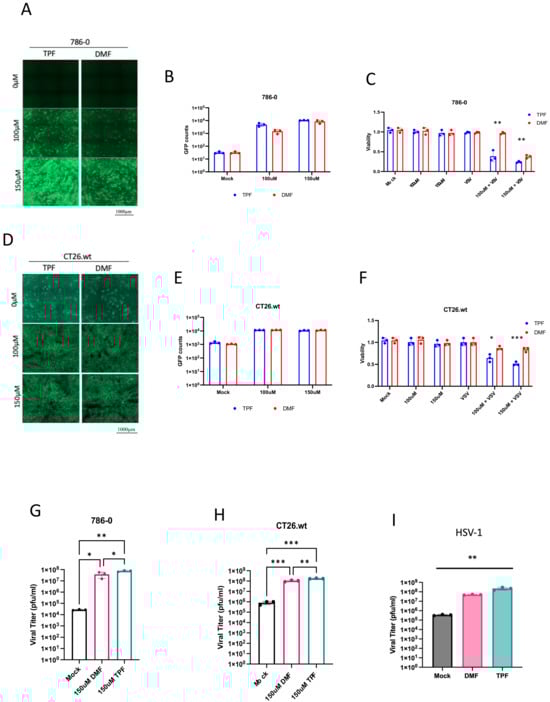TPF demonstrates a superior effect in enhancing OV infection within cancer cells. (A,B,D,E) 786-0 and CT26.wt cells were first pre-treated with TPF and DMF (100 µM and 150 µM) for a duration of 4 h then infected with VSVΔ51 at MOI (0.05). The 24 h post infection GFP counts were counted (N = 3, mean ± SD). (C,F) Metabolic viability assay was assessed using Resazurin dye (N = 3, mean ± SD; * p < 0.05, ** p < 0.01, *** p < 0.001; unpaired t-test). (G,H) The samples were quantified for viral titer by standard plaque assay (N = 3, mean ± SD; * p < 0.05, ** p < 0.01 *** p < 0.001; one-way ANOVA with Tukey’s multiple comparisons test). (I) The 786-0 cells were treated with either TPF or DMF concentration of 150 µM then infected with HSV.n212 expressing GFP (MOI 0.02). Corresponding fluorescent images were taken 48 h post infection. Supernatants were collected at 72 h post infection for viral titer quantification by plaque assay (mean ± SD; ** p < 0.01 by one-way ANOVA).