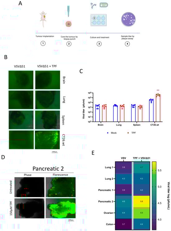 BALB/c mice were implanted with CT26.wt 3 × 105 colon cancer cells. Once tumor volumes reached 1500 mm3, the mice were euthanized, and relevant tissues were extracted. For human tissue samples, tumor samples were collected from patients who had given informed consent and followed the Declaration of Helsinki guidelines during surgical resection. The collection of human tissue/fluid for this study was made possible by the Global Tissue Consent and Collection Program at the Ottawa Hospital Research Institute. All the tissues were sliced into 2 mm sections and circular cores of 2 mm diameter were extracted using a punch biopsy tool. These cores were then kept in a humidified incubator at 37 °C and 5% CO2 in DMEM supplemented with 10% serum, 30 mM HEPES, 1% (v/v) penicillin–streptomycin and 0.25 mg/L amphotericin B. The cores were treated with TPF for four hours and then infected with VSVΔ51 at 3 × 104 pfu/core. After 24 h post-infection, fluorescence images were captured using the EVOS Live Cell Imaging System (Thermo Fisher, San Francisco, CA, USA) the supernatant was assessed for viral titer by standard plaque assay.