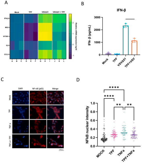 Utilizing quantitative PCR (qPCR), we measured the transcription levels of key antiviral and pro-inflammatory genes—specifically IFN-β, MX2, IFITM1, IL6, and CCL5—in the 786-0 cells subjected to TPF (150 µM) treatment or vehicle. Following a four-hour incubation, these cells were either infected with VSVΔ51 or left uninfected. Our findings demonstrate that the TPF treatment leads to a significant downregulation of the above antiviral and pro-inflammatory genes as shown in (Figure 4A). In addition to qPCR analyses, an enzyme-linked immunosorbent assay (ELISA) was conducted to quantify IFN-β in the supernatant of cell cultures. The results corroborated the qPCR findings, with TPF demonstrating a consistent downregulation of IFN-β secretion as shown in (Figure 4B). This further confirms that TPF modulates the antiviral response in 786-0 cells, enhancing their susceptibility to VSVΔ51 infection and underscoring the potential of TPF as a facilitator in oncolytic virus therapy. In line with the suppression of the type I interferon response, TPF treatment led to a reduction in the activation (indicated by phosphorylation) of both STAT1 (signal transducer and activator of transcription 1) and STAT2, observed 24 h post-infection (Figure S3).