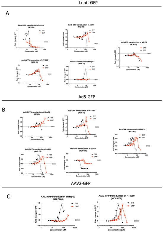 The impact of TPF in the transduction of lent-GFP, AVV-2, and Ad5-GFP. (A) Jurkat, HT1080, A549, HepG2, or MRC5 cells were seeded in 96-well plates and pre-treated for 4 h with 4–100 μM TPF (black lines) or 9–250 μM DMF (red lines) in triplicate. The cells were transduced with lentivirus encoding GFP at an MOI of 10. A total of 70 h post transduction, the plates were imaged for GFP and mean fluorescence per well determined using the Agilent Biotek Cytation5. The GFP mean intensity was quantified and plotted (N = 3, unpaired t-test was performed comparing to the DMSO-treated, transduced condition). (B) Jurkat, HT1080, A549, HepG2, or MRC5 cells were seeded in 96-well plates and pre-treated for 4 h with 4–100 μM TPF (black lines) or 9–250 μM DMF (red lines) in triplicate. The cells were transduced with Ad5 encoding GFP at the indicated MOIs. A total of 70 h post transduction, the plates were imaged for GFP and mean fluorescence per well determined using the Agilent Biotek Cytation5. GFP mean intensity was quantified and plotted (N = 3, unpaired t-test was performed comparing to the DMSO-treated, transduced condition). (C) HT1080 or HepG2 cells were seeded in 96-well plates and pre-treated for 4 h with 4–100 μM TPF (black lines) or 9–250 μM DMF (red lines) in triplicate. The cells were transduced with AAV2 encoding GFP at the indicated MOIs. A total of 70 h post transduction, the plates were imaged for GFP and mean fluorescence per well determined using the Agilent Biotek Cytation5. GFP mean intensity was quantified and plotted (N = 3, unpaired t-test was performed comparing to the DMSO-treated, transduced condition. * p < 0.05, ** p < 0.01, *** p < 0.001, **** p < 0.0001).