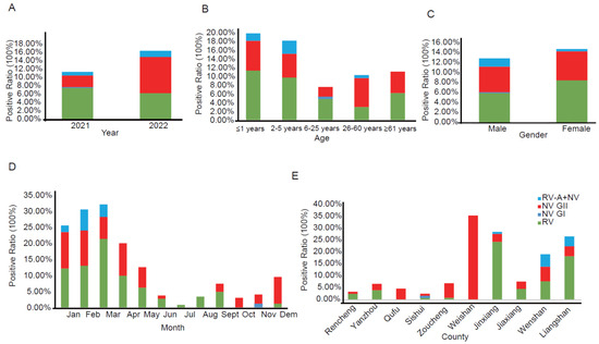 The epidemiological characteristics of norovirus and rotavirus. (A) Positive rates of norovirus and rotavirus in 2021 and 2022. (B) Infection-positive rates of norovirus and rotavirus in different age groups. (C) Infection-positive rates of norovirus and rotavirus in different genders. (D) Infection-positive rates of norovirus and rotavirus in different months. (E) Infection-positive rates of norovirus and rotavirus in different counties. “■” RV-A, “■” NVGI, “■” NVGII, “■” RV-A + NV GII.