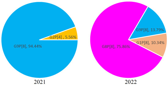 In 2021, the G2P[4] genotype of RV-A in Jining City accounted for 5.56% (1/18), while the G9P[8] genotype accounted for 94.44% (17/18). This indicates that the prevalent RV-A genotype in Jining City in 2021 was primarily G9P[8], co-circulating with the G2P[4] genotype. In 2022, the G1P[8] genotype of RV-A in Jining City accounted for 10.35% (3/29), the G8P[8] genotype accounted for 75.86% (22/29), and the G9P[8] genotype accounted for 13.79% (4/29) (Figure 2). This suggests that the prevalent RV-A genotypes in Jining City shifted to predominantly G8P[8] in 2022, with concurrent circulation of G1P[8] and G9P[8] genotypes. This study indicates that there may have been a change in prevalent RV-A genotypes between 2021 and 2022 in Jining City.