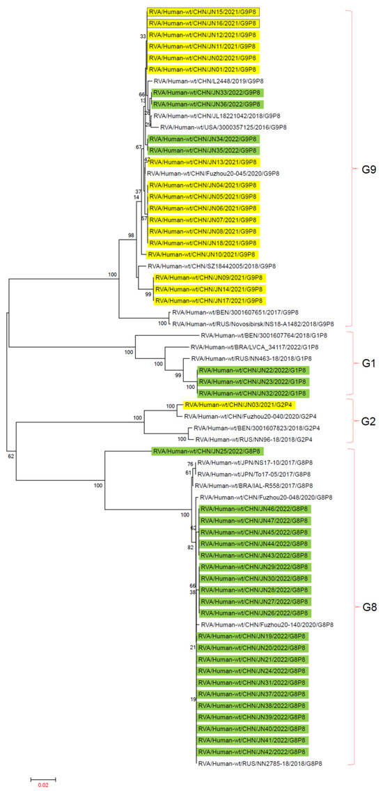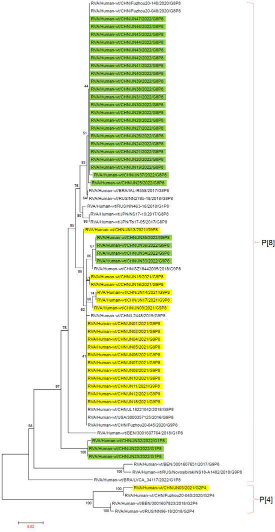 To determine the genotypes of RV-A in Jining City from 2021 to 2022, sequencing of the VP7 and VP4 genes was conducted on RV-A-positive samples, resulting in a total of 47 sequences. According to the VP7 gene typing, also known as G genotypes, in the 47 sequences collected from Jining City between 2021 and 2022, the G1 genotype accounted for 6.38% (3/47), G2 genotype accounted for 2.13% (1/47), G8 genotype accounted for 46.81% (22/47), and G9 genotype accounted for 44.68% (21/47). No G3 or G4 genotypes were detected. Based on the VP4 gene typing, also known as P genotypes, in the 47 sequences from Jining City between 2021 and 2022, the P[4] genotype accounted for 2.13% (1/47), and the P[8] genotype accounted for 97.87% (46/47). No P[6] genotypes were found (Figure 2).