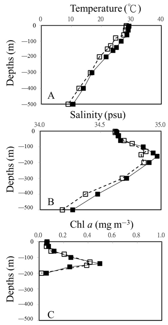 Vertical profiles of temperature (A), salinity (B), and Chl a (C) at out of eddy (OE) (white squares) and eddy core (EC) (black squares).
