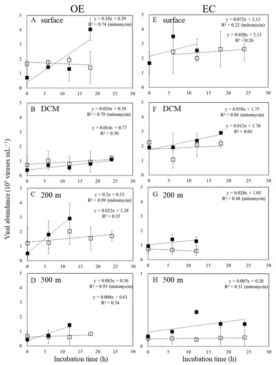 Temporal variations in mean and standard deviation of viral abundance during 24 h incubations for viral production in the surface water (A,E), DCM (B,F), 200 m (C,G), and 500 m depth (D,H) at OE and EC stations. □: control treatments; ■: mitomycin treatments.