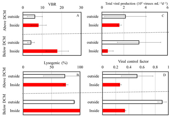 Mean and standard deviation of virus-to-bacteria ratio (VBR) (A), the percentage of lysogenic to total viral production (%) (B), total viral production (C), and viral control factor (D) above and below DCM region at OE (white bars) and EC (red bars).