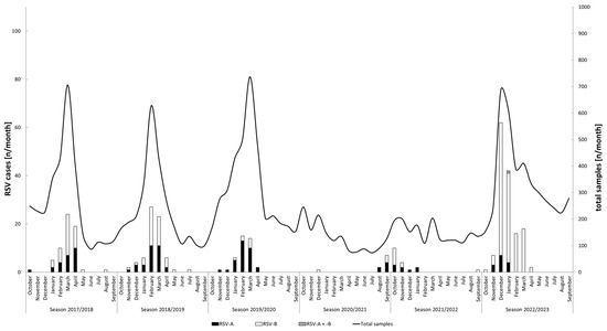 Monthly distribution of total number of samples tested and new RSV cases (n = 343) stratified by RSV-A and -B. Note the two different y-axes: the left y-axis refers to the bar charts and shows the absolute number of detected RSV cases while the right y-axis refers to the absolute number of samples tested, as represented by the line graph. The x-axis is labeled according to the definition that was used to define the start and end of a respiratory season.