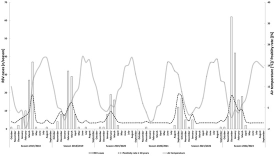 The peak RSV detections coincided with the lowest temperatures of the year (Figure 2), except for the 2021/2022 season. The peak positivity rates for seasons 2017/2018, 2018/2019, 2019/2020, 2021/2022, and 2022/2023 were 9.3%, 6.8%, 3.8%, 9.4%, and 9.1%, respectively.