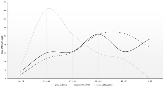 A relative age stratification into six age groups within RSV cases comparing the pre-pandemic seasons, the 2021/2022 season, and the 2022/2023 season is shown in Figure 3. A significant age difference was detected between those time periods (p < 0.001), originating from the high percentage of patients in the 25–44 years group in the 2021/2022 season in comparison to the pre-pandemic cohort (p < 0.001) and the patients of the 2022/2023 season (p = 0.005).