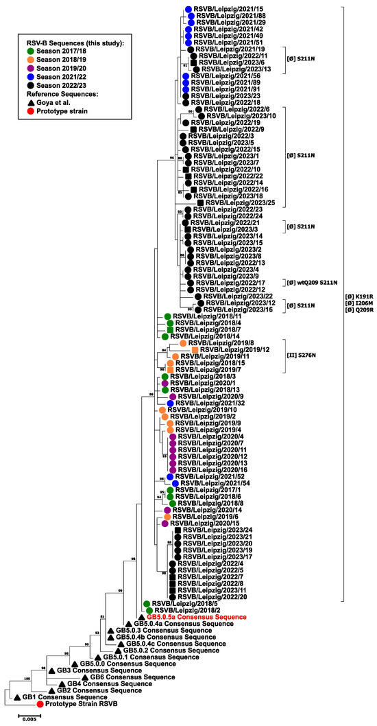 Molecular phylogenetic analysis of the RSV-B F gene by the maximum likelihood method. The evolutionary history was inferred using the maximum likelihood method based on the Tamura–Nei model [39]. The tree with the highest log likelihood (−4220.58) is shown. The percentage of trees in which the associated taxa clustered together is shown next to the branches. Initial tree(s) for the heuristic search were obtained automatically by applying Neighbor-Joining and BioNJ algorithms to a matrix of pairwise distances estimated using the Maximum Composite Likelihood (MCL) approach and then selecting the topology with superior log likelihood value. The tree is drawn to scale, with branch lengths measured in the number of substitutions per site. The analysis involved 105 nucleotide sequences. There were a total of 1725 positions in the final dataset. Evolutionary analyses were conducted in MEGA7 [38]. Only nodes with statistical support > 80% are shown. The following symbols indicate the sequence origin or the season of the indicated strain: dots/squares. Red, RSV-B prototype strain; green: season 2017/2018 isolates; orange, season 2018/2019 isolates; purple, season 2019/2020 isolates; blue, season 2021/2022 isolates; black, season 2022/2023 isolates; squares, fatal cases; black triangle: consensus reference sequences according to Goya et al. [16]. Amino acid changes in sites Ø and II with regard to the GA2.3.5 consensus sequence (red) are given in brackets. Note that for the RSVB/Leipzig/2022/17 strain, no amino acid change was noted at position 209 (wtQ209).