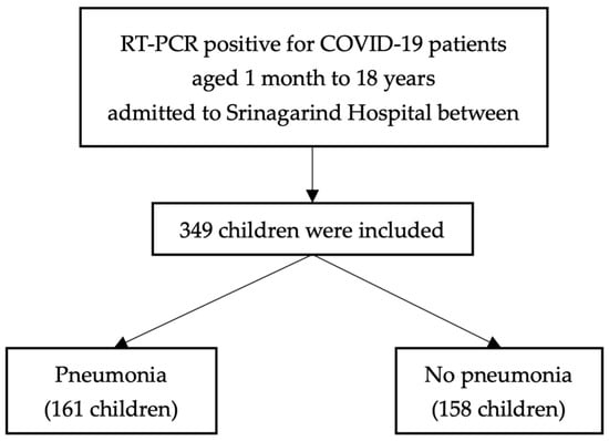 We conducted a retrospective review of pediatric patients aged 1 month to 18 years who tested positive for COVID-19 through reverse transcription–polymerase chain reaction (RT-PCR) from 13 January 2020 to 15 November 2021, based on the official electronic medical record (Health Object® program), at the Srinagarind Hospital, Faculty of Medicine, Khon Kaen University, Thailand. All confirmed COVID-19 patients were required to be hospitalized for isolation during the study period. Patients with multisystem inflammatory syndrome in children (MIS-C) and perinatal transmission were excluded from the study.