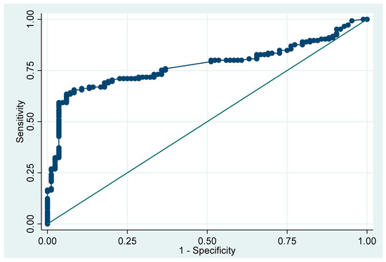 The analysis revealed that the CRP and monocyte levels were potentially associated with COVID-19 pneumonia (Table 3). After conducting a multivariate analysis, we found that monocytosis was the only factor associated with COVID-19 pneumonia in the children (aOR 30.85, 95% CI: 9.03 to 105.41, p < 0.001), while CRP did not show statistical significance (aOR 1.07, 95% CI: 0.96 to 1.19, p = 0.242). The area under the ROC curve for monocytosis in predicting COVID-19 pneumonia was 0.77 (95% CI: 0.71 to 0.83) (Figure 2).