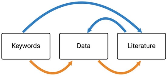 The bibliographic search and data collection strategy used. A flow diagram depicting the two search strategies used for data collection, with the blue arrows representing search strategy 1, and orange arrows representing search strategy 2.