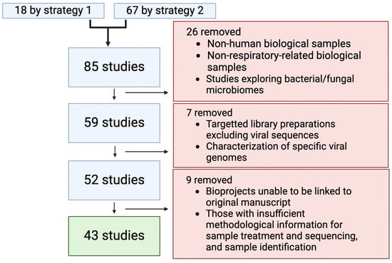 Two strategies were used to collate lung virome studies for which sequencing data was publicly available (Figure 1). Strategy 1 involved a literature search on PubMed, utilizing specific keywords related to “lungs”, “sputum” or “lavage fluid”, “next generation sequencing” or “metagenomics”, “bioinformatics”, and “lung virome” (Table S1), and identified 18 studies with associated sequencing data obtained from the indicated repositories (Figure 2). Strategy 2 involved exploring sequence data repositories from NCBI Sequence Read Archive (SRA), NCBI Gene Expression Omnibus (GEO), and EMBL-EBI European Nucleotide Archive (ENA), using specific keywords related to “lung virome”, “bacteriophages”, “metagenomics”, and “shotgun sequencing” to capture bioprojects that may contain unique information not yet linked to a published study. This second strategy yielded 67 unique studies (Figure 2).