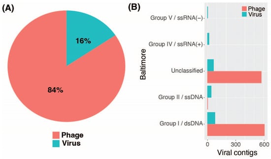 EVEREST identified a total of 1842 contigs based on quality, of which 1414 were assigned taxonomy. Among these, 146 (8%) were classified as proviruses and excluded from further analysis, while the remaining 1696 (92%) were classified as viruses (Figure S3). EVEREST annotated 1193 (84%) contigs as bacteriophages, and the remaining 221 (16%) were identified as eukaryotic viral contigs (Figure 3A). Contigs were also grouped following the Baltimore classification system [52]. Most of the bacteriophage contigs (610, 51%) were classified as Group I, corresponding to double-stranded DNA bacteriophages. Six bacteriophage contigs (0.5%) were classified as Group II, representing single-stranded DNA bacteriophages. The remaining bacteriophage contigs could not be classified within the Baltimore system as they were not classified taxonomically to the family level. Eukaryotic viral contigs were distributed across four specific Baltimore groups, with the highest proportion (83, 37%) identified as Group I, followed by Group II (43, 20%), Group IV (20, 9%), and Group V (7, 3%) (Figure 3B).