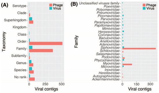 Bacteriophage taxonomy was annotated to the order level (513, 43%), family level (366, 30%), subfamily rank (13, 1%), genus level (64, 5%), and species level (71, 6%). The remaining bacteriophage contigs were assigned to higher taxonomic ranks, including superkingdom (64, 5%) and clade (15, 1%), with 87 contigs (7%) unassigned to taxonomy (Figure 4A). Eukaryotic viral contigs were classified at the superkingdom (47, 21%), family (51, 23%), genus (36, 16%), or species (46, 21%) level. The remaining contigs were annotated at different taxonomic ranks or unassigned (15, 7%) (Figure 4A).
