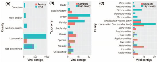 Genome quality assessment of the viral contigs and taxonomic characterization of the complete and high-quality genomes. (A) Bar plots represent the distribution of the 1842 contigs classified based on their quality as determined by CheckV [34]. Blue bars represent viral genomes, while red bars represent proviruses. (B) Bar plots representing the number of complete (red) and high-quality (blue) genomes that were assigned at each taxonomic rank. (C) Bar plots representing the number of complete (red) or high-quality (blue) viral genomes that were assigned to the indicated viral families.