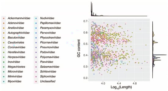 To confirm that there was no bias in contig assembly associated with the different bioprojects, GC content and length were evaluated for the assembled genome for the 1414 eukaryotic and bacteriophage viral contigs assigned to taxonomy down to the family level (Figure 6). Contigs were distributed in a bimodal distribution regarding their GC content, with values ranging from 0.2 to 0.7. The contig length distribution was right-skewed, with values ranging from 5000 to 130,000 bp (Figure 6). Contigs annotated to specific families were clustered around similar GC content values, while contig length was neither associated with specific viral families nor linked to altered GC values, suggesting no bias in contig generation across different bioprojects.