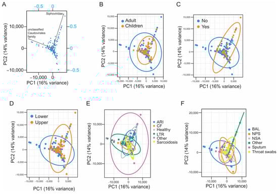 (A–F) A projection of the samples included in this study in the two first components of the PCA model. (A) A biplot showing the PCA score plot and the loading plot. The left and bottom axes represent the PCA scores of the samples, and the top and right axes indicate how strong each feature (vector) influences the principal components. Vectors represent features with at least a 0.6 correlation coefficient with any of the two first components of the PCA model, and their project values on each principal component indicates how much weight they have on those specific components of the PCA model. The unclassified family within Caudovirales is negatively correlated with component 1 and represents the major source of variation along this component. Conversely, Siphoviridae exhibit a positive correlation with component 1. Distribution across component 2 is mostly driven by Siphoviridae (positive correlation) and to a lesser extent by the unclassified family within Caudovirales. For each PCA graph, dots represent individual samples. Samples are labelled based on whether they were obtained from adults (blue) or children (orange) (B), whether they were obtained from healthy individuals (orange) or individuals with disease (blue) (C), whether they were obtained from the lower (blue) or upper (orange) respiratory tract (D), the specific respiratory pathology (E), or the type of specimen used to sample the airways (F). ARI: acute respiratory infection; CF: cystic fibrosis; LTR: lung transplant recipient; BAL: bronchoalveolar lavage; NPS: nasopharyngeal swabs; NSA: nasopharyngeal aspirates.