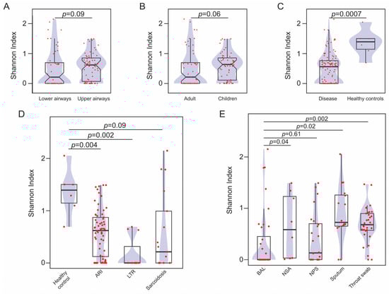 Shannon index diversity of viral families identified in lung samples. (A–E) Box plots displaying the comparison in alpha viral diversity between samples from the upper and lower respiratory tract (A), between samples collected from adults and children (B), between samples obtained from healthy controls or individuals with disease (C), between samples obtained from patients with different respiratory pathologies and healthy controls (D), and between bronchoalveolar lavage fluid and other type of specimens from the respiratory tract (E). Red dots represent individual datapoints. Only groups containing more than three datapoints were included in these analyses. The density plots (shaded blue area) represent the probability distribution for each data group. Differences between the indicated groups were evaluated using a Wilcoxon rank sum test and the resulting p-values are indicated in each panel. In A and B, notches in the boxplot represent the 95% confidence interval for the median. In D and E, p-values were corrected using the Bonferroni method. ARI: acute respiratory infection; LTR: lung transplant recipient; BAL: bronchoalveolar lavage; NSA: nasopharyngeal aspirates; NPS: nasopharyngeal swabs.