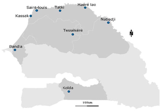 The study area included various geographical regions of the country, including a semi-desert zone with an annual rainfall of around 300 mm in the north and a forest zone characterized by an annual rainfall of up to 1000 mm in the south (Figure 1). The other sampling sites were located in the center of the country featuring a wooded savannah. In the northern and central regions, temperatures vary from 20 °C on the coast to 48 °C inland, depending on the season. The southern regions record minimum temperatures of around 22 °C and maximum temperatures of 38 °C, mainly during the dry season. Overall, eight sampling sites were arbitrarily selected, and sampling was performed in July 2021 during the rainy season.