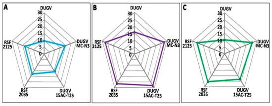 Radar plots representing the number of substitutions that have occurred in the small ((A), blue), medium ((B), purple), and large ((C), green) genomic segments. The sequence of isolate IB AR 1792 was used as a reference, retrieved from the oldest collection (dated 1964). The number of nucleotide substitutions in the M segment of DUGV strains is greater than that in the L or S segments. Isolates DUGV_2035, DUGV_2125, and MC-N3 could be considered to constitute the most genetically divergent group in comparison with DUGV isolate IB AR 1792.