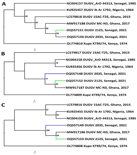 Dendrograms for near-complete Dugbe orthonairovirus genomic segments (nucleotide sequences). Phylogenetic analysis was performed using individual substitution models: for S segment, HKU + I; for M segment, GTR + I + G; and for L segment, GTR + G. The robustness of trees was tested using 1000 bootstrap replicates and numbers at the tree nodes represent bootstrap support values. Nucleotide sequences used in phylogenetic analysis were as follows (GenBank numbers in brackets): DUGV isolate ArD 44313 isolated in Senegal in 1985 (NC_004157-NC_004159), DUGV isolate Ib Ar 1792 isolated in Nigeria in 1964 (KU925455-KU925457), DUGV 15AC-T25 isolated in Ghana in 2015 (LC579816-LC579818), and DUGV isolate MC-N3 also isolated in Ghana in 2017 (MW917186-MW917188). The closely related Kupe virus isolate KT99/74, isolated in Kenya in 1974 (OL774808-OL774810), was used as an outgroup. (A) S segment sequences; (B) M segment sequences; (C) L segment sequences. The branches for isolates RSF_2035 (blue) and RSF_2125 (green) are highlighted.