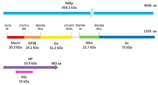 Proteomic organization. Predicted signal peptidase (SP) cleavage sites and putative cleavage sites of the M segment are labeled. Regions corresponding to the RdRp (light blue), Mucin (red), GP38 (orange), Gn (yellow), NSm (green), Gc (blue), NP (purple) and NSs (pink) are shaded. Reading frames of NP and NSs are shown by arrows.