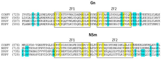 The Gn tail of the Dugbe virus contains ββα-type zinc finger motifs. Conserved CXCXHXC motifs of cysteine and histidine (where X is any amino acid), characteristic of ββα-type zinc fingers, are also present at the N-terminus of the NSm protein. It can be seen that CCHFV also has such motifs at this site, but there are no characteristic basic residues in the vicinity of the CCHC motifs. They are also present in DUGV and Kupe virus (KUPV) (Figure 6).