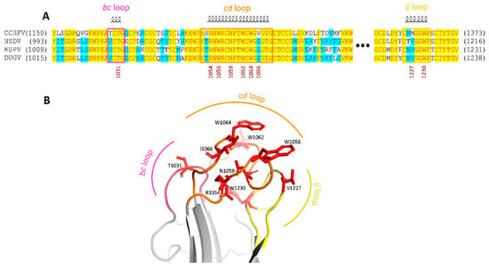 A close amino acid composition of the fusion loop structure is found between the CCHF virus, DUGV, and their closest relatives (NSDV, KUPV) (Figure 7A). Indeed, based on the alignment and spatial structure (Figure 7A,B), the basic amino acids are highly conserved.