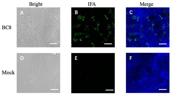 Immunofluorescent microscope image of uninfected HRT-18 cells (mock) and HRT-18 cells infected with the BCoV BC8 strain showing BCoV antigens in green color in the cytoplasm of infected cells and syncytia containing different numbers of nuclei. The BCoV antigens were detected by primary antiserum guinea pig hyperimmune serum raised against the BCoV Mebus strain (B). The blue is for nuclei staining with DAPI. The merged images are shown (C). The same BC8-infected cells under light microscopy, showing cytopathic effects (A). Uninfected HRT-18 cells under bright light (D), under immunofluorescent light (E), and merged with DAPI (F) are shown. Scale bar: 50 μm.