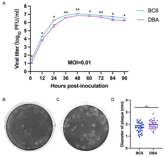 The plaque morphology of the BC8 and DBA strains exhibited noticeable differences in size (Figure 3B,C). The average plaque size of BC8 was measured to be 1.72 ± 0.39 mm in diameter, while the average plaque size of DBA was slightly larger at 1.99 ± 0.34 mm, based on measurements of 30 plaques (Figure 3D). Importantly, the plaque size of DBA was significantly larger than that of BC8 (p < 0.01).