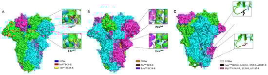 The 3D structural analyses of the predicted S protein trimers of BCoV strains using protein structure prediction software online (https://swissmodel.expasy.org/, accessed on 25 April 2024). The surface model used BC8 and LUN strains as templates and the stick model used all corresponding strains to predict. The location of amino acid residue 617 in the predicted S protein trimer is shown in blue and red in the detailed stick model for Iso617 in the BC8-E strain and yellow for Thr617 in the BC18-R strain (A). The location of amino acid residue 960 in the predicted S protein trimer is shown in orange, the detailed stick model for Pro960 in the BC8-E strain is shown in brown, and Leu960 in the BC18-R strain is shown in purple (B). The location of amino acid residue 1180 in the predicted S protein trimer is shown in white, the detailed stick model for Asp1180 in the BC8-E, AH65-E, ENT-E, and AH187-E strains is shown in black, and Gly1180 in the AH65-R, LUN-R, and AH187-R strains is shown in a warm pink color (C).