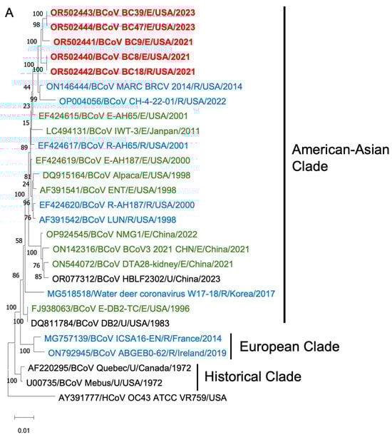 To gain insights into the BCoV genetic diversity over the past few decades, we conducted phylogenetic analyses of the WGS, S proteins, and HE proteins. The WGS phylogenetic analysis included 21 historical BCoV strains and one human coronavirus OC43 strain as a control (Figure 6). The BCoV strains were primarily categorized into three genetic clades: (1) Historical clade, representing early classical strains such as Mebus and Quebec, (2) European clade, and (3) American–Asian clade. The new isolates were clustered within the American–Asian clade.