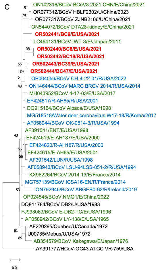 For the RT-qPCR targeting the conserved M gene, the previously reported forward primer (5′-CTGGAAGTTGGTGGAGTT-3′), reverse primer (5′-ATTATCGGCCTAACATACATC-3′), and probe (6-carboxyfluorescein-CCTTCATATCTATACACATCAAGTTGTT-black hole quencher 1) [18] were synthesized by Integrated DNA Technologies (https://www.idtdna.com/pages, accessed on 25 April 2024), and the reaction system was implemented using 2 μL of RNA and the Qiagen OneStep RT-PCR kit (Qiagen, Valencia, CA, USA) on RealPlex real-time thermocyclers (Eppendorf, Barkhausenweg, Hamburg, Germany). Both viral genomic and several subgenomic RNAs that contain the M gene are detected by this assay. The whole genome sequence (WGS) of the BC18 strain was obtained using conventional PCR with multiple primers (shown in Supplementary Table S1) followed by Sanger sequencing at the Comprehensive Cancer Center of The Ohio State University or Oxford nanopore sequencing at Plasmidsaurus (https://www.plasmidsaurus.com/, accessed on 25 April 2024). Initially, viral RNA was reverse transcribed to cDNA using the SuperScript™ IV cDNA synthesis kit (Invitrogen, Carlsbad, CA, USA) employing a strategy combining oligo(dT) and random hexamers’ priming. Subsequently, the cDNA was amplified with the BCoV-specific primers using the high-fidelity PrimeSTAR GXL DNA polymerase (TaKaRa, Toshima-ku, Tokyo, Japan). The PCR reaction mixture (50 μL) consisted of 2 μL of cDNA, 10 μL of 5× PCR buffer, 4 μL of deoxynucleotide triphosphates (dNTPs) (2.5 mM each), 2 μL of GXL PCR enzyme, and 1 μL each of forward and reverse primers (10 µM each). The PCR reaction followed thermal cycling conditions: 98 °C for 30 s, 30 cycles of 98 °C for 10 s, 55 °C/60 °C for 15 s, and 68 °C for 1–3 min, with a final extension step at 68 °C for 5 min. PCR products were analyzed using 1% agarose gel electrophoresis to confirm the proper sizes of amplicons. Subsequently, PCR products of the correct size were purified using the QIAquick Gel extraction kit (Qiagen, Valencia, CA, USA) for subsequent sequencing.