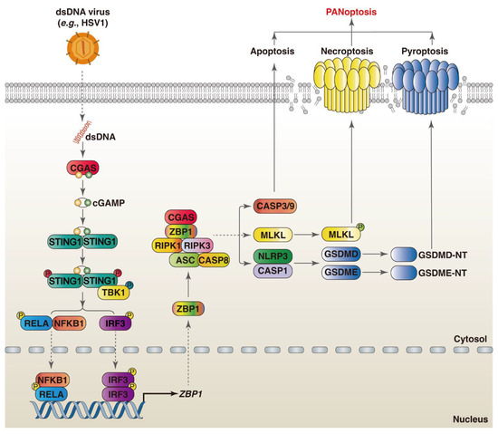AIM2: absent in melanoma 2; ASC, apoptosis-associated speck-like protein containing a C-terminal caspase recruitment domain; CASP1/3/8, caspase (numbers 1/3/8); cGAMP, cyclic guanosine monophosphate–adenosine monophosphate; CGAS, cyclic GMP-AMP synthase; dsDNA, double-stranded DNA; dsRNA: double-stranded RNA; GSDMD; gasdermin D; GSDME; gasdermin E; GSDMD-NT, N-terminal gasdermin D; GSDME-NT, N-terminal gasdermin E; HSV1: herpes simplex virus 1; IAV: influenza A virus; MHV: mouse hepatitis virus; MLKL, mixed lineage kinase domain like pseudokinase; NFKB1, nuclear factor kappa B subunit 1; NLRP3, NLR family pyrin domain containing 3; RELA, RELA proto-oncogene; RHIM: receptor-interacting protein homotypic interaction motif; RIPK1: receptor-interacting protein kinase 1; RIPK3: receptor-interacting protein kinase 3; ssRNA: single-stranded RNA; STING1, stimulator of interferon response cGAMP interactor 1; TBK1, TANK-binding kinase 1; Zα: Z-nucleic acid-binding domains; ZBP1, Z-DNA-binding protein.