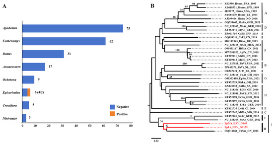 HepV detection, species identification, and virus classification. (A) HepV detection in different animal hosts in Yunnan Province, China. HepV-negative and -positive samples are indicated in blue and orange, respectively. (B) Maximum likelihood phylogenetic tree of the partial VP2 (313 bp) of two novel shrew HepVs and representative known HepVs. The novel shrew HepVs discovered in this study are presented in red (unmarked as unclassified Hepatovirus).