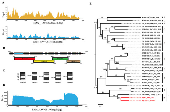 Next-generation sequencing (NGS) of GS63 and GS159 revealed that GS63 sequencing produced 348 reads, fully covering the entire genome of EpMa-HAV-GS63 (99.45%), except for the 5′ UTR end. However, EpLe-HAV-GS159 sequencing yielded only 112 reads, with 80.01% coverage and multiple gaps (Figure 2A). RACE and Sanger sequencing were employed to complete the sequences at both ends of EpMa-HAV-GS63 and EpLe-HAV-GS159. Due to multiple gaps in EpLe-HAV-GS159, amplicon primers were designed based on the NGS results for nucleic acid enrichment (Table 1). The entire length was divided into four amplification reactions (Figure 2B,C), followed by QNome nanopore sequencing (QNS). The third-generation sequencing of EpLe-HAV-GS159 yielded a total of 110,327 reads, providing 99.99% coverage of the amplicon fragments A to D, except for the RACE at both ends (Figure 2D).